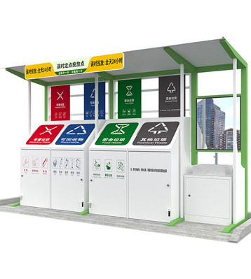設有擋雨棚,可配備垃圾箱信息顯示屏、防水照明燈、廣告屏,進行地面硬化。對社區玻金塑紙可回收物,其他垃圾,廚余垃圾,有害垃圾等生活垃圾定時定點投放收集.